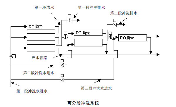 對于多段反滲透系統(tǒng),為了能夠更有效的沖洗膜元件,系統(tǒng)的設(shè)計有必要按可以分段沖洗進(jìn)行設(shè)計。反滲透分段沖洗的優(yōu)點有: