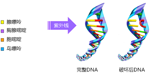 光量子理論認為,光是物質運行的一種特殊形式,是一粒粒不連接的粒子流。每一粒波長 253.7nm 的紫外線光子具有 4.9eV 的能量。當紫外線照射到微生物時,便發生能量的傳遞和積累,積累結果造成微生物的滅活,從而達到消毒的目的。生命科學揭示了核酸是一切生命體的基本物質和生命基礎,微生物體受到紫外線照射,吸取了紫外線的能量,實質是核酸對紫外線能量的吸收。核酸分為核糖核酸(RNA)和脫氧核糖核酸(DNA)兩大類,其共同點是由磷酸二脂鍵按嘌呤與嘧啶堿基配對的原則而連接起來的多核苷酸鏈。紫外線一方面可使核酸突變、阻礙其復制、轉錄封鎖及蛋白質的合成;另一方面,產生自由基可引起光電離,從而導致細胞的死亡。