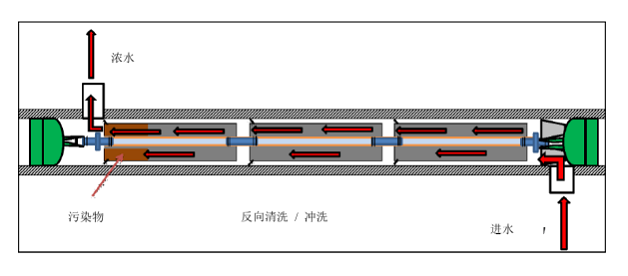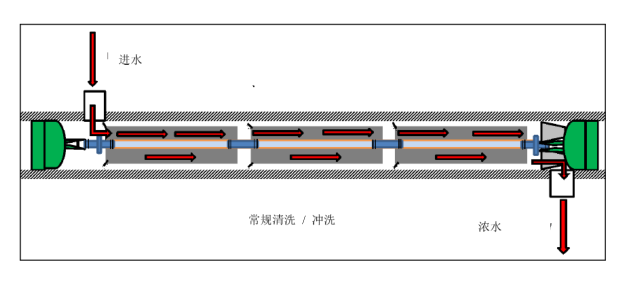 常見的反滲透的沖洗設(shè)計一般是從壓力容器進(jìn)水端流入,經(jīng)過膜元件后從壓力容器濃水端流出,這個流向與反滲透系統(tǒng)正常運行時是一樣的。反滲透的反向沖洗指的是由濃水端向進(jìn)水端方向進(jìn)行沖洗的過程, 反向沖洗有助于去除反滲透系統(tǒng)的前端污染物,采用此方法進(jìn)行沖洗反滲透膜元件受到的污染更小;當(dāng)有顆粒物(細(xì)砂、活性炭)時,必須采用此方法,以免反滲透膜表面被劃傷。需要注意的是任何時候嚴(yán)禁由產(chǎn)水端向進(jìn)水端進(jìn)行沖洗,這會造成反滲透膜元件背壓,使反滲透膜元件受到不可逆轉(zhuǎn)的損害。
